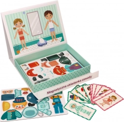 - Rijke uitrusting – 12 kleurrijke kaarten met figuren en 74 magnetische kledingstukken.
