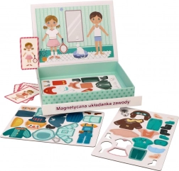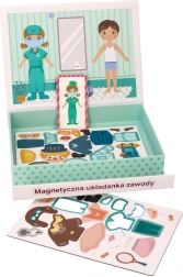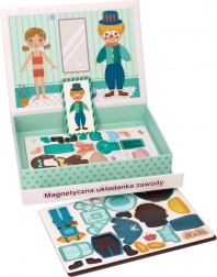 Deze magnetische puzzel in een koffertje brengt kinderen de wereld van verschillende beroepen bij in de vorm van een geliefde “aankleed”-activiteit. Kinderen zetten figuurtjes en hun uniformen samen op het magnetische bord, laten zich inspireren door kaartjes of maken hun eigen combinaties. Het spel stimuleert op natuurlijke wijze verbeeldingskracht, geduld en leren door spel.