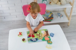 Dankzij het duurzame gelakte oppervlak en de gladde randen is het speelgoed geschikt voor dagelijks gebruik. Het ondersteunt oog-handcoördinatie, geduld en concentratie, terwijl kinderen op een natuurlijke manier bosdieren leren kennen.
