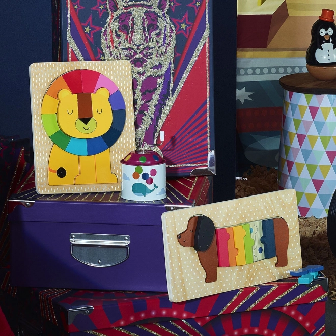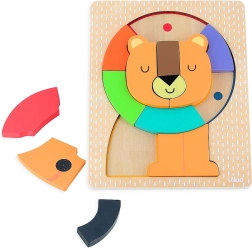 Deze hoogwaardige houten inlegpuzzel met leeuwenthema biedt kinderen leren door spel. Elke plek op de basisplaat is kleurgecodeerd, wat helpt bij oriëntatie en succesvol puzzelen. Dankzij de stevige en gladde stukjes is de puzzel ideaal voor jonge kinderen vanaf 2 jaar.