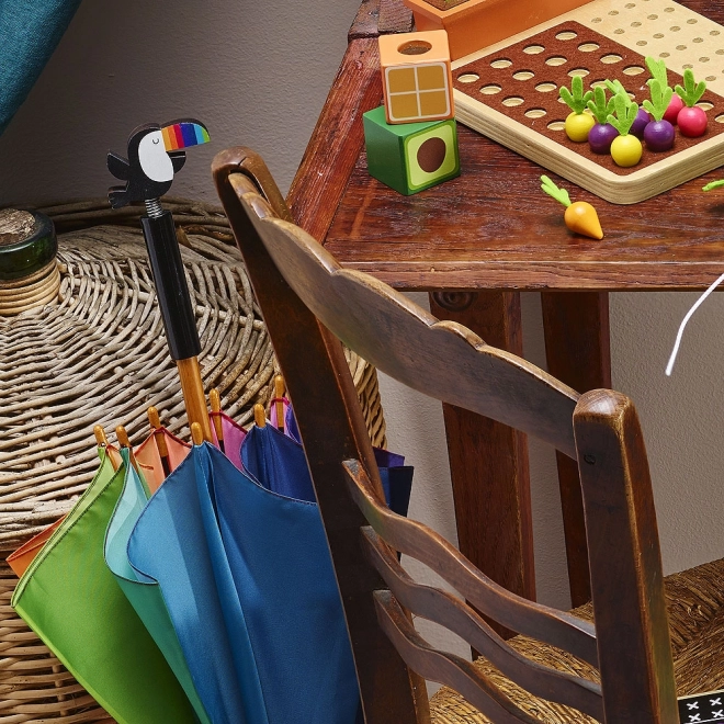Deze kleurrijke kinderparaplu verandert elke bui in een vrolijk avontuur. De regenboogpanelen en de iconische toekanknop geven een speelse look, terwijl de robuuste constructie bescherming biedt tegen regen en wind. Ideaal voor kinderen vanaf 3 jaar.