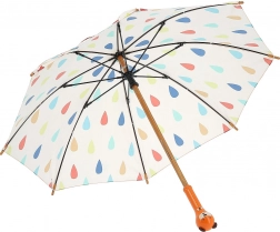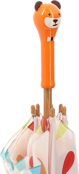 De gelakte houten handgreep in de vorm van een beer ligt prettig in de hand en maakt van elke regenbui een feestje.