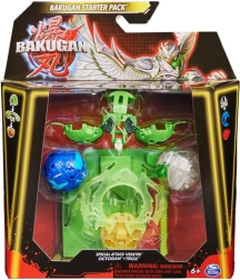 Startset met 3 Bakugan-krijgers uit serie 6. De verpakking bevat 1 Bakugan Speciale Aanval (rotatie), 1 Ring, 1 treklint, 2 Core Bakugan, 3 karakterkaarten, 2 Gate-kaarten, 1 kaart Speciale Aanval, 3 Brawler-kaarten, instructies en spelregels. Geschikt vanaf 6 jaar.