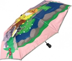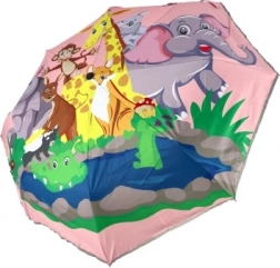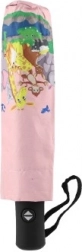 De paraplu heeft een kleurrijke dierenprint op een roze achtergrond, wat elke regenachtige wandeling vreugdevol en speels maakt.