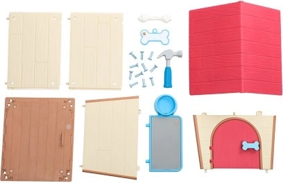 Een set ideaal voor een kleine of beginnende klusser. Bouw het huisje van de bijgevoegde onderdelen, giet water in het bakje, geef de pup een naam en spijker het naamplaatje op de deur van het huisje...