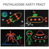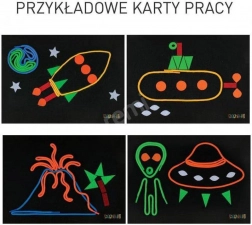 - Complete uitrusting in de doos – LED-zaklamp met fluorescerende stift, 16 gekleurde snoeren in verschillende lengtes, klittenbandbord, houder–pen, gekleurde viltdelen met doosje en 4 werkkaarten (8 motieven).