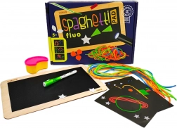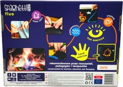 Ontdek Spaghetti Fluo – een slimme creatieve set die fluorescerende effecten, gekleurde klittenband-snoeren en een LED-zaklamp met fluorescerende stift combineert. Kinderen trainen hun fijne motoriek, oog-handcoördinatie en juiste pengreep terwijl ze fantasierijke afbeeldingen maken op de meegeleverde sjablonen.