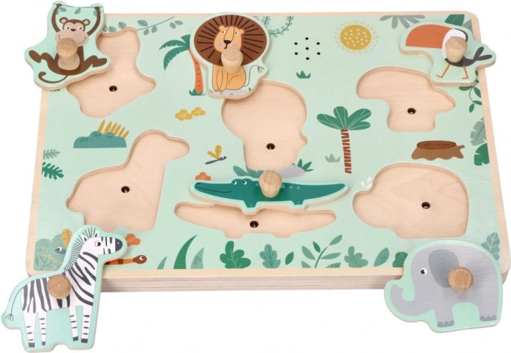 Met deze geluids-puzzel leren kinderen niet alleen vormen, maar ook de geluiden van safaridieren. Het ondersteunt de ontwikkeling van de fijne motoriek en het auditieve waarnemingsvermogen.