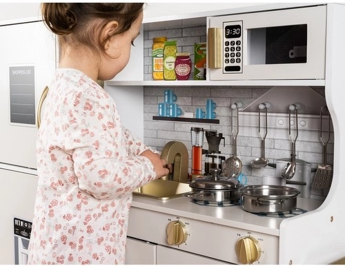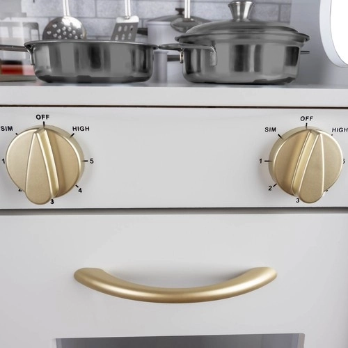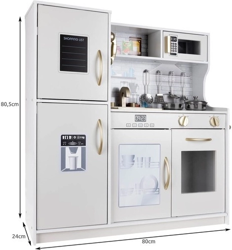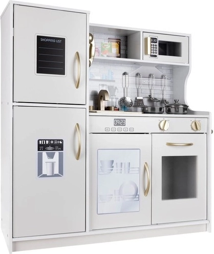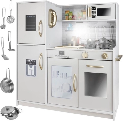 Deze houten XL keuken is ontworpen voor urenlang speelplezier. De geïntegreerde LED-verlichting plaatst u naar wens onder of in het kastje of in de oven, en de draaibare schakelaars met klikgeluid wekken de indruk van echt koken. De robuuste MDF-constructie en het elegante wit-gouden design worden de blikvanger van de kinderkamer.
