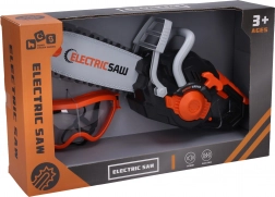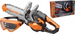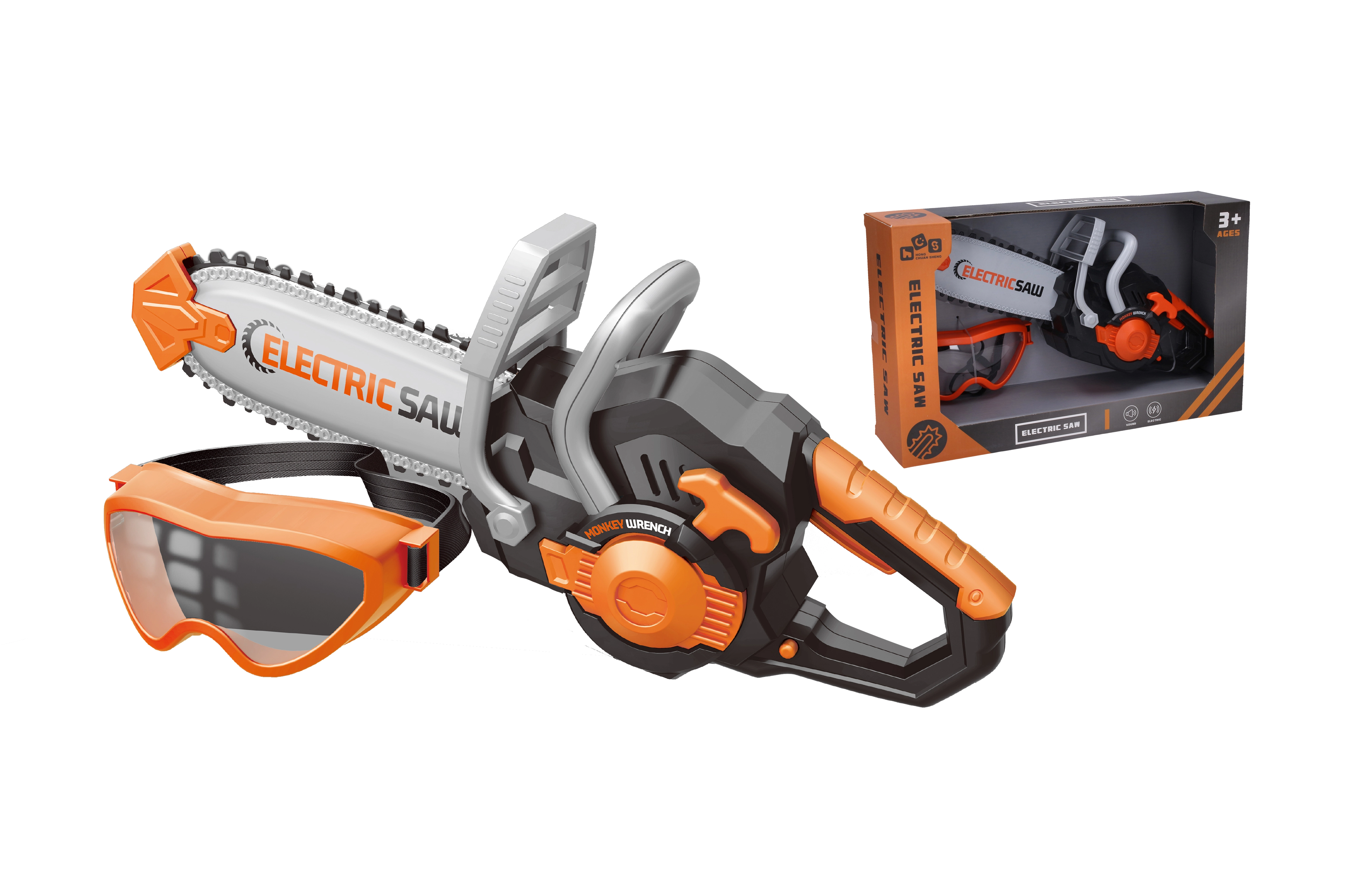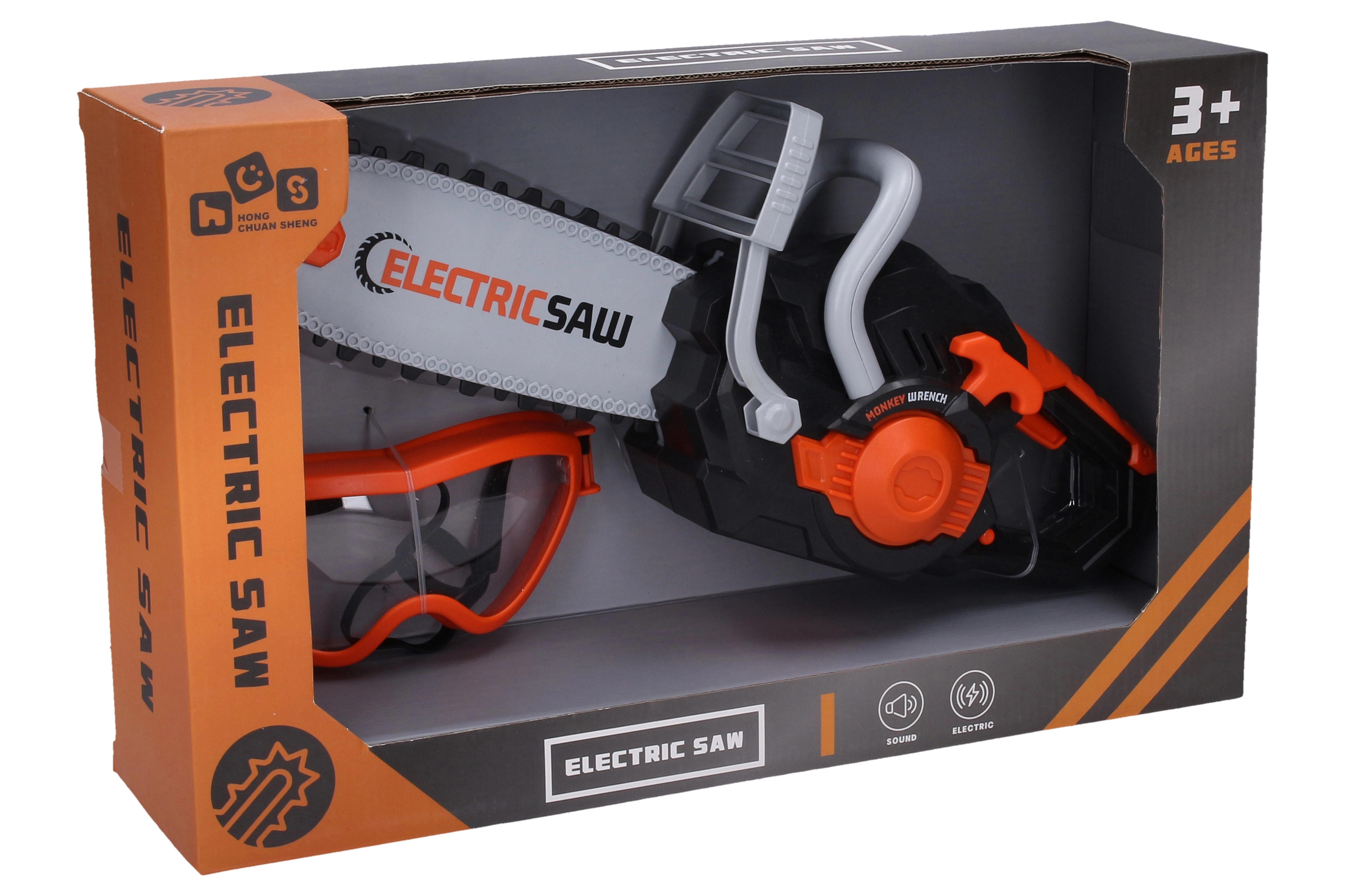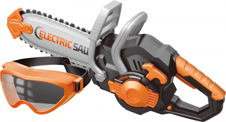 De veiligheidsbril zorgt voor veiligheid tijdens het spelen. De knop aan de linkerkant maakt eenvoudige activering van de zaag mogelijk, wat bijdraagt aan een realistische speelervaring.