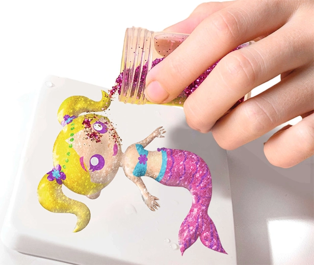 Applicatieflesjes met smalle tuit maken inkleuren en fijne details eenvoudig. Glitter geeft de zeeminnenfiguren een betoverende glans.