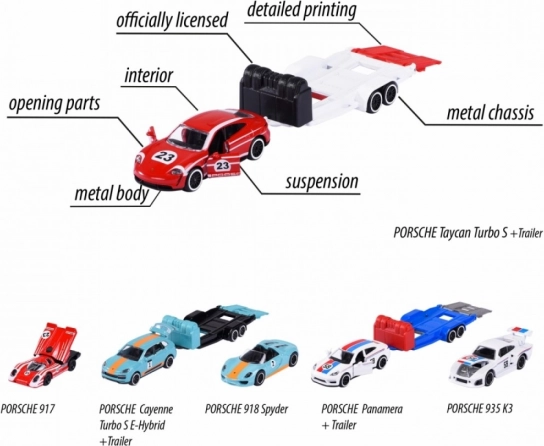 Elke set biedt een uniek duo van race- en trekauto met aanhanger. Mogelijke combinaties: Cayenne Turbo S E‑Hybrid + 918 Spyder; Panamera + 935 K3; Taycan Turbo S + 917.