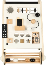 De loopwagen bevat schuivende kralen, vormsortering en draaiende blokken die fijne motoriek en coördinatie bevorderen.