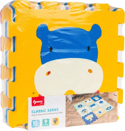 Een kleurrijke kinder-speelmat van schuimpuzzels met dieren biedt veilig en leuk spelen voor kinderen vanaf 10 maanden. Van 9 delen leg je een zachte vloeroppervlakte die tegen kou isoleert en vallen dempt, of je bouwt er 3D-figuren zoals een kubus van. De delen van veilig EVA-schuim hebben een antislipstructuur, zijn waterbestendig, makkelijk schoon te maken en de uitneembare dieren stimuleren de ontwikkeling van motoriek en vormherkenning.