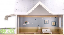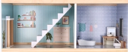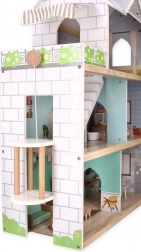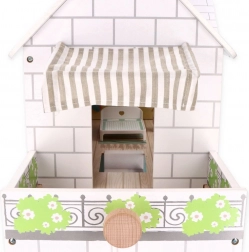 Dit stijlvolle poppenhuis van hoogwaardig hout biedt kinderen een realistische omgeving met een woonkamer, keuken, slaapkamers en een balkon. Dankzij de meerdere verdiepingen en rijke details ondersteunt het de fantasie en fijne motoriek en bevordert het sociale vaardigheden tijdens het samen spelen.
