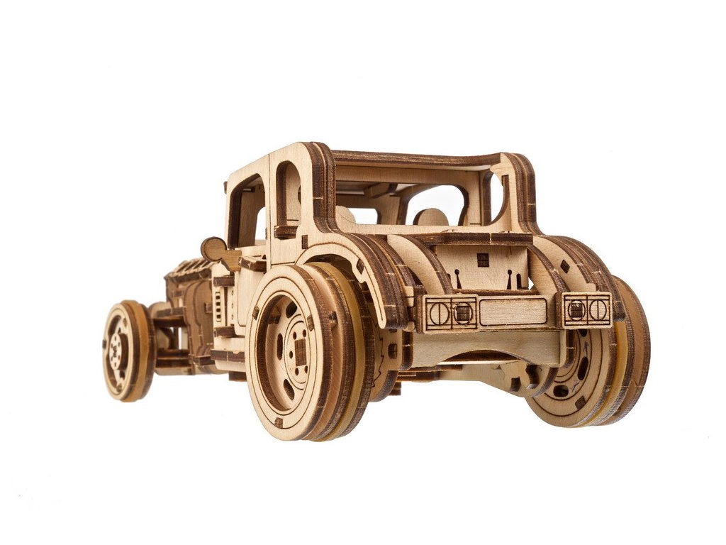 Het model is ontworpen om te vermaken tijdens het bouwen én tijdens het rijden. Na zorgvuldig “inlopen” van het chassis geniet je van een soepele tandwieloverbrenging en een dynamische start. In natuurlijk hout ziet het er stijlvol uit, maar je kunt het gerust beschilderen naar je eigen smaak. Een geweldig cadeau voor fans van hot rods, mechanica en design.
