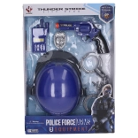 - Pistool 20 cm (akoestische geluidseffecten), politiebadge, walkietalkie, handboeien met sleutel, helm