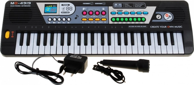 Verder aanwezig: volumeregeling en temporegeling, opname en programmeren, een Stop-knop en de modus S.E/Play. De meegeleverde microfoon maakt zingen en geluid mogelijk, en de ingebouwde luidspreker zorgt voor voldoende volume. Dankzij voeding via een USB-adapter of 4× AA-batterijen kun je overal spelen.