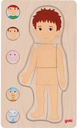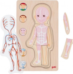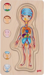 Ontdek op speelse wijze hoe het menselijk lichaam werkt! Deze houten, gelaagde puzzel van GOKI toont een jongen in vijf niveaus – van huid via spieren en organen tot aan het skelet. Kinderen oefenen tijdens het leggen hun fijne motoriek, ontwikkelen logisch denken en verwerven basiskennis van anatomie op een leuke en inzichtelijke manier.