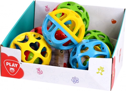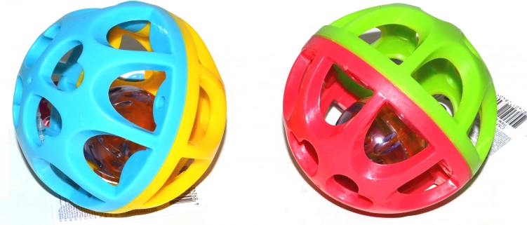 Kwalitatieve en veilige bal met rammelaar voor kinderen, in twee kleurvarianten; ondersteunt de ontwikkeling van zintuigen en motoriek.