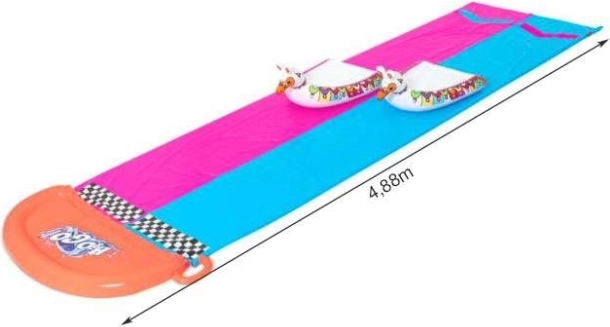 Twee parallelle banen van 4,88 m laten kinderen tegen elkaar racen en genieten van een lange, snelle glijrit met watersproeiers over de hele lengte.