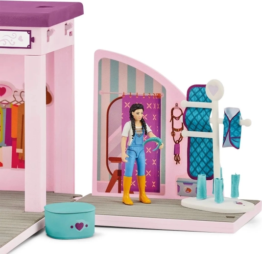 De opvouwbare paardenstyling-salon uit de Schleich HORSE CLUB Sofia's Beauties-collectie is ideaal voor alle paardenliefhebbers. Hij biedt prachtige dekens en accessoires in meerdere kleuren, zodat elk paard iets naar zijn smaak vindt. Wist je dat je de manen en staart van de paarden niet alleen kunt kammen en stylen, maar ook eenvoudig kunt wisselen? Zo hoeven Sofia en haar merrie niet bij één look te blijven. Perfect voor elke fotoshoot, zelfs als het gewoon in de achtertuin is. De set is eenvoudig in te klappen en voor onderweg weer uit te klappen.