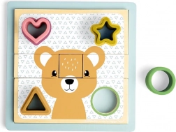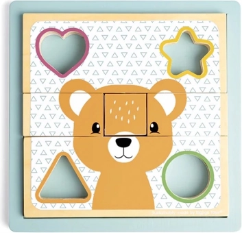 Deze veelzijdige houten puzzel lijkt op het eerste gezicht een sorteerspel, maar onthult bij nader bekijken zijn tweede gezicht – een legpuzzel met verrassende afbeeldingen. Draai de afzonderlijke stukjes om, plaats ze in de juiste uitsparingen en leg een schattige beer of vos. Dankzij de combinatie van hout en prettig aanvoelende siliconen zijn de stukjes eenvoudig te hanteren en bestand tegen intensief kinderspel.