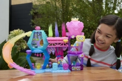 Ontdek de iconische setting uit de film TROLLS BAND TOGETHER in de speels kleurrijke Mount Rageous-set. Kinderen kunnen Poppy’s lange haar stylen, spulletjes verstoppen in Hair Pops, concerten geven op het podium en via de glijbaan tussen verdiepingen roetsjen. Meer dan 25 mode- en verhalende accessoires (microfoon, kapstok, gitaar met “edelsteen” en meer) prikkelen de fantasie en de rol van koningin Poppy.