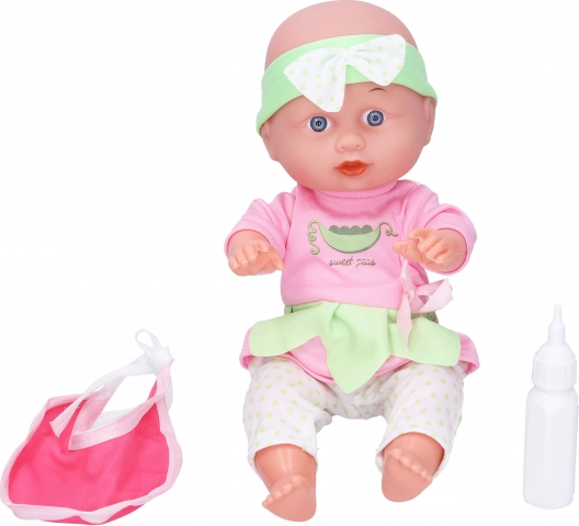 Schattige baby met kinderwagen, ideaal voor kinderspel en het ontdekken van de fantasiewereld. Het pakket bevat een opvouwbare kinderwagen, een slabbetje, en een flesje voor een complete speelervaring.