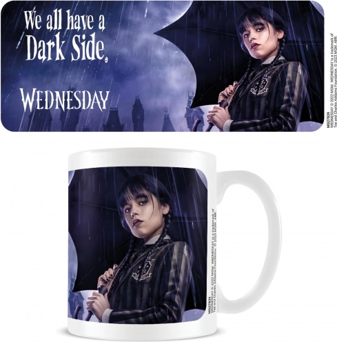 Stijlvolle keramische mok met het motief van Wednesday en het citaat “We all have a Dark Side”, perfect voor je dagelijkse koffie of thee. Biedt een inhoud van 315 ml, is geschikt voor magnetron en vaatwasser en wordt geleverd in een cadeaubox.