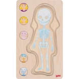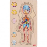 Deze puzzel toont het menselijk lichaam in vijf lagen; elke laag laat gedetailleerd verschillende lichaamssystemen zien, van botten en spieren tot interne organen.