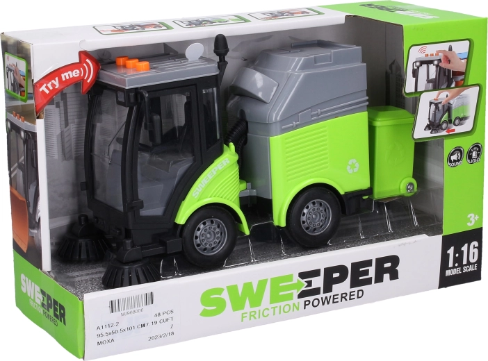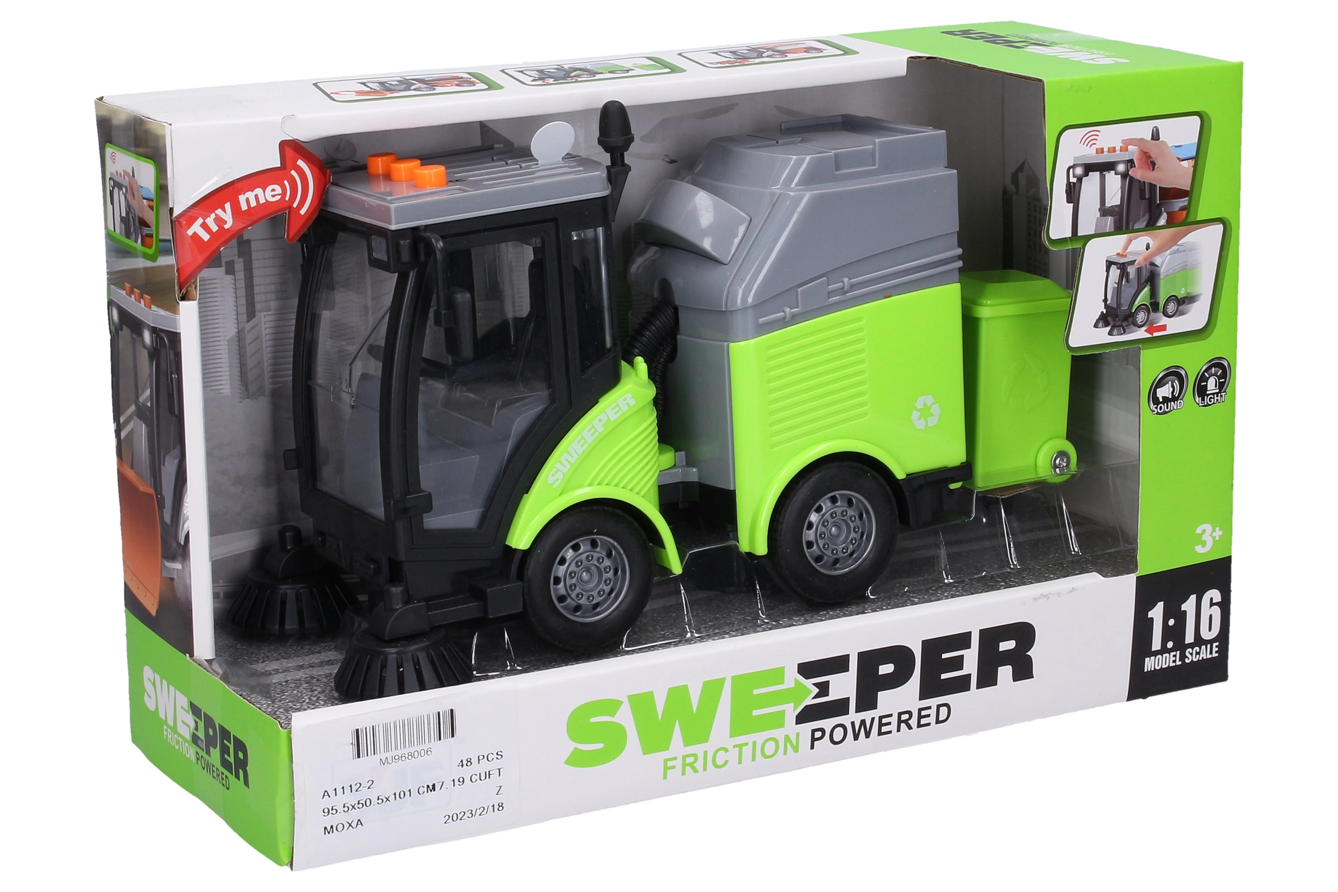 Kleine bestuurders zullen de gedetailleerde reinigingswagen met vuilnisbak geweldig vinden, die een realistische ervaring van stadsverkeer biedt. Dankzij de frictiemotor hoef je het autootje alleen maar een zetje te geven en het zoeft vanzelf vooruit. De knoppen op de cabine starten effecten die een echt voertuig natuurgetrouw nabootsen: motorstart, claxon en achteruitrijgeluid met bijbehorende lichten.
