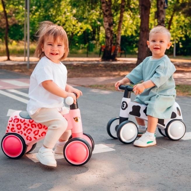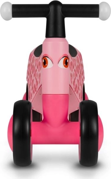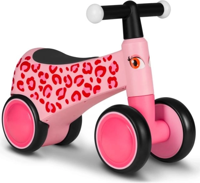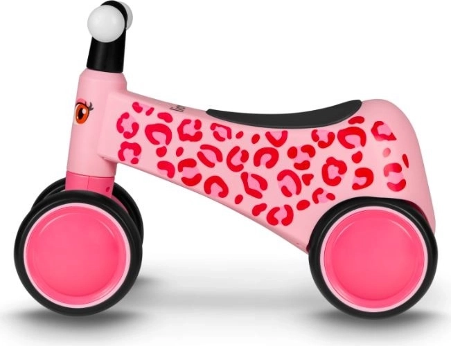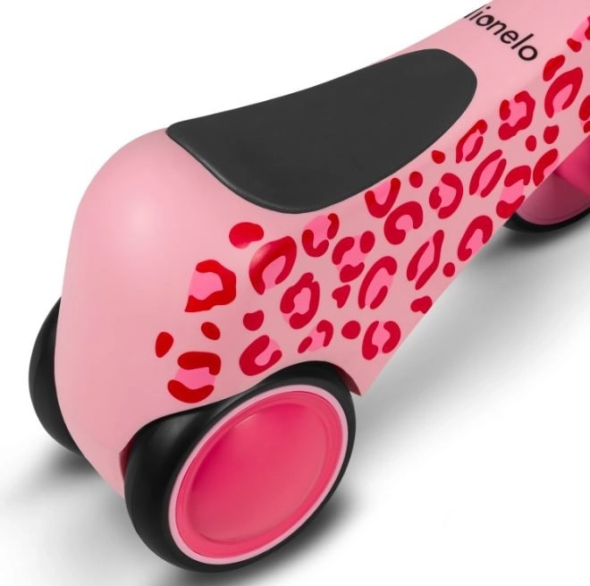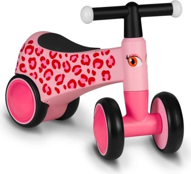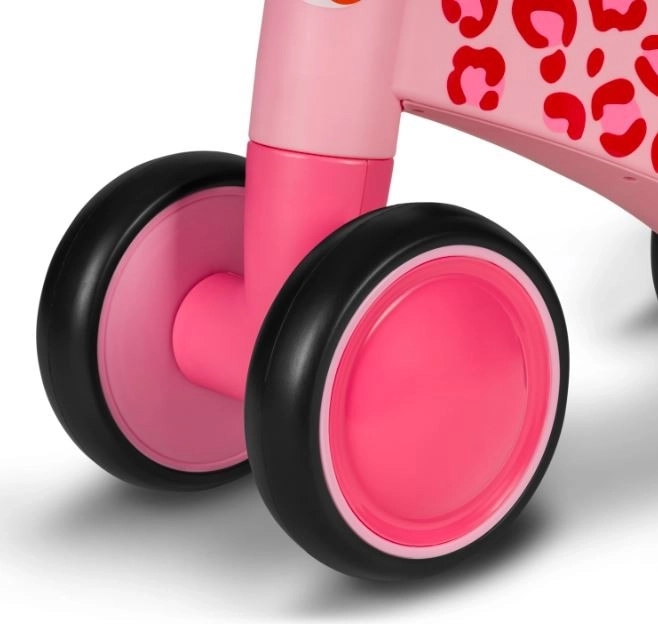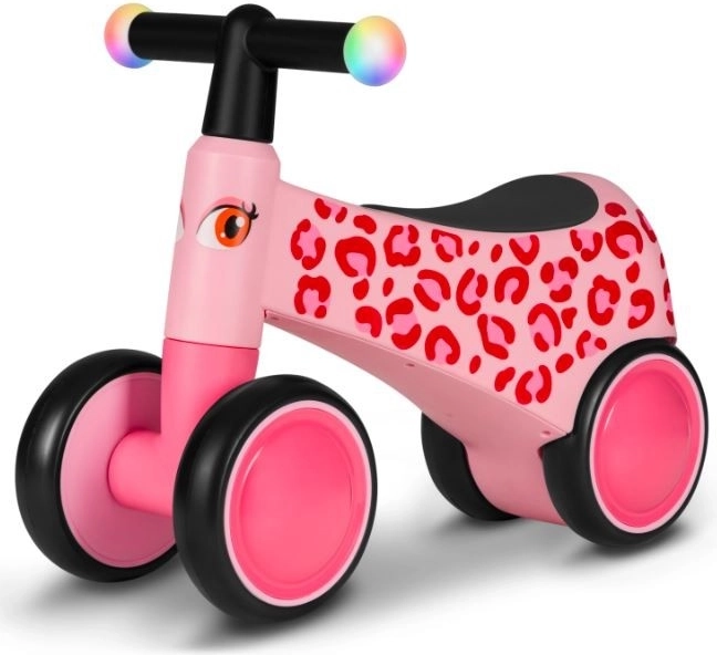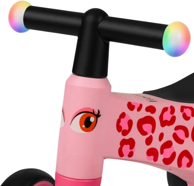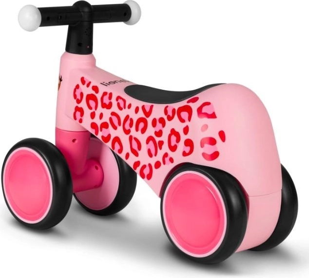 Schattige kinderloopfiets Lionelo Sammy Pink Rose, geïnspireerd op de roze panter, ondersteunt de ontwikkeling van evenwicht en motoriek. Heeft 4 stabiele wielen, een ergonomische constructie, een comfortabel dubbel gewatteerd zadel en oplichtende grip-ends met bewegingssensor. De lichte constructie is gemakkelijk te dragen en te onderhouden – gewoon afnemen met een vochtige doek.