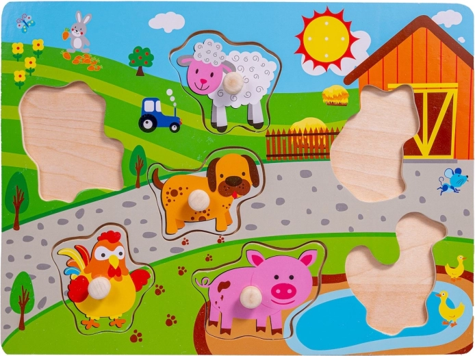 Houten puzzel – knopjes met afbeeldingen van dieren van de boerderij/hoeve – kip, kat, hond, schaap, eend, enz.