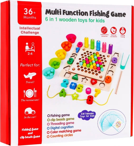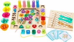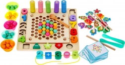 | | Dit speelgoed is bedoeld voor kinderen vanaf drie jaar. Het bevat 6 spelvoorstellen voor de allerkleinsten. Vissen met een hengel Het kind moet een vis of ander zeedier vangen met een hengel met magneet, en traint zo coördinatie, juiste greep en geduld. Kralenspel volgens het patroon op kaartjesHet kind trekt een van de 18 kaartjes en probeert vervolgens het patroon van het kaartje na te maken op het bord met gaten, waarbij het visuele waarneming, grove motoriek, oog-handcoördinatie, geheugen en ruimtelijke oriëntatie ontwikkelt. Letters en cijfers vergelijken Letters en cijfers vergelijken Het kind rangschikt letters en cijfers in de overeenkomstige uitsparingen op het bord, oefent opmerkzaamheid, verwerft vaardigheden in ruimtelijke oriëntatie en ontwikkelt fijne motoriek. Kleuren sorteren Het kind plaatst kleurrijke ringetjes op de stokjes en probeert tien dezelfde ringetjes op elk stokje te krijgen; zo wordt oog-handcoördinatie en een juiste greep geoefend. Letters en cijfers rijgen aan een koord Het kind probeert letters en cijfers aan een koord te rijgen en ontwikkelt motoriek, handigheid, creativiteit en geduld. Kleurige bakvormpjes Het kind legt gekleurde bolletjes in de vormpjes voor cupcakes en probeert in elk vormpje bolletjes van dezelfde kleur te hebben; het leert kleuren herkennen en ontwikkelt motoriek en ruimtelijke oriëntatie. Het speelgoed is volledig van hout gemaakt, dus duurzaam en veilig voor het kind. |