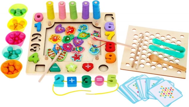 | | - groot bord met gaten voor letters, cijfers en stokjes, - kleiner bord met gaten voor kralen, - 15 zeedieren, - 10 cijfers van 0 tot 9, - 5 geometrische vormen: vierkant, driehoek, ster, hart, cirkel, - 2 hengels, - 2 stokjes, - pincet, - lepeltje, - koord, - 5 vormpjes voor cupcakes, - 18 dubbelzijdige kaartjes met patronen, - 60 kralen, elk 12 in roze, groen, blauw, geel, oranje, - 50 ringetjes, elk 10 in blauw, paars, roze, geel, groen, - 5 wasknijpers. |