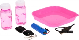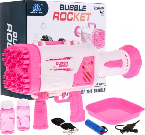 - Bellenblaaspistool, 2× vloeistof, 3,7 V-accu, stickers, draagkoord, USB-oplaadkabel, schaaltje voor vloeistof