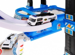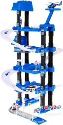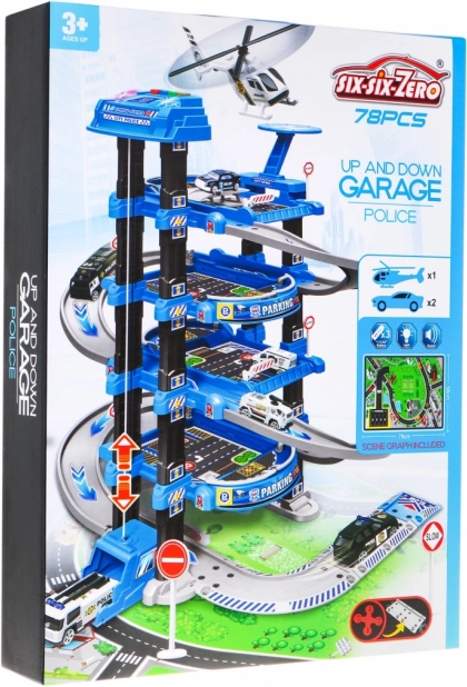 Deze robuuste, meerlaagse politieparkeergarage combineert leuke ritten over hellingen met een functionele lift die omhoog en omlaag gaat en vergezeld wordt door knipperende lampjes en geluidseffecten (voeding 3× AA, niet inbegrepen). Op het bovenste niveau vind je een helihaven, de lagere verdiepingen bieden parkeerplaatsen en doorgangen.