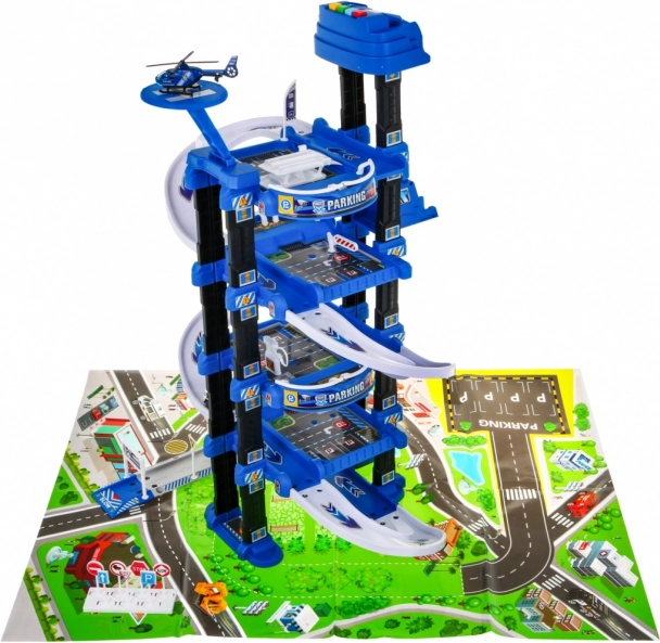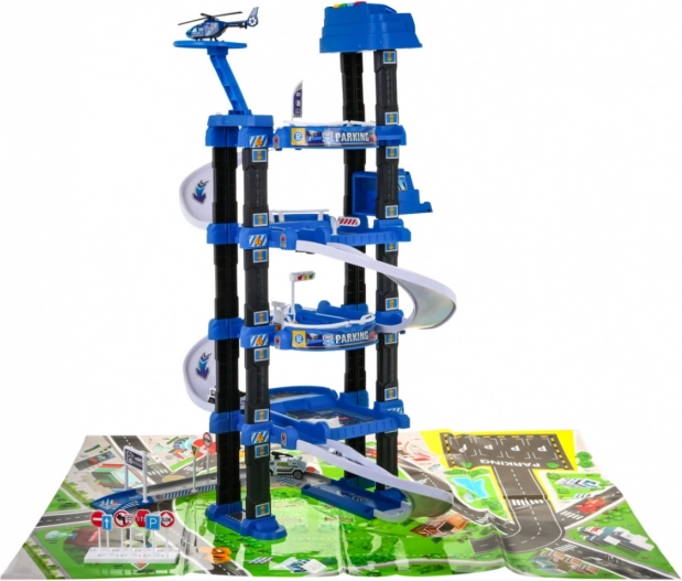 De meerlaagse constructie biedt ritten tussen verdiepingen, parkeerplaatsen en een landingsplatform voor een helikopter. Ideaal voor dynamisch, creatief spel.