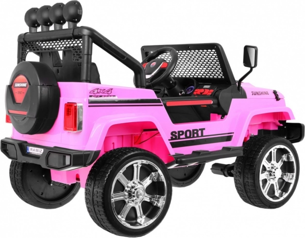 Stijlvolle roze elektrische terreinwagen Raptor Drifter met vierwielaandrijving (4x4), soepele start, 2,4 GHz afstandsbediening en LED‑verlichting. Dankzij de zachte EVA‑wielen, zitting van eco‑leer met gordels en audiopaneel met Bluetooth/MP3/FM is hij ideaal voor een veilige en leuke rit. Een praktische opbergruimte in het reservewiel en een inklapbare transporthandgreep maken dagelijks gebruik eenvoudiger.