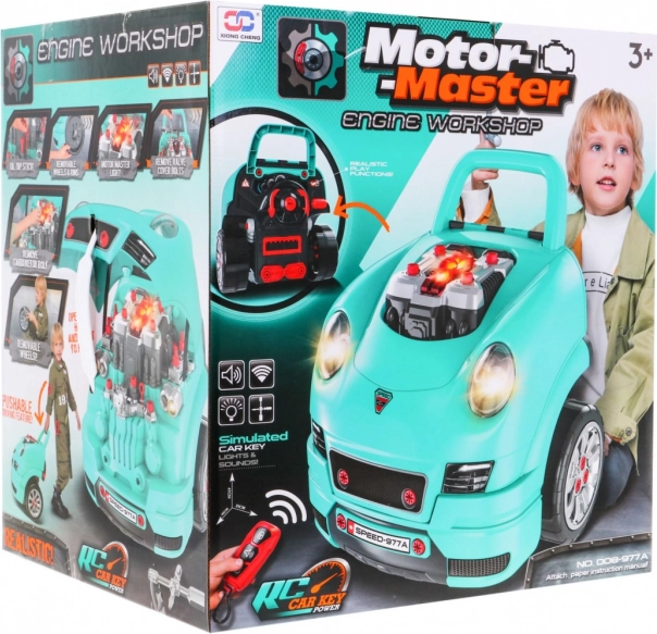 Deze complete set voor de “kleine monteur” brengt de voorzijde van een auto met een rijk uitgeruste motor om te (de)monteren, een werkend dashboard met startknop, stuur met claxon en waarschuwingssignaal. Kinderen kunnen bougies, wielen en motoronderdelen “servicen”, terwijl ze de lichten en geluiden bedienen met de meegeleverde afstandsbediening.