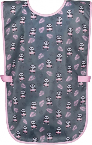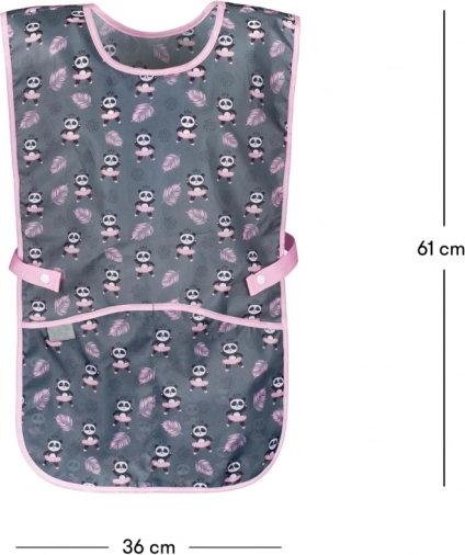 Het kinder schort met pandamotief is ontworpen om kinderen te beschermen tijdens verschillende activiteiten. Het heeft een grijze basis met kleurrijke elementen die speels en elegant ogen.