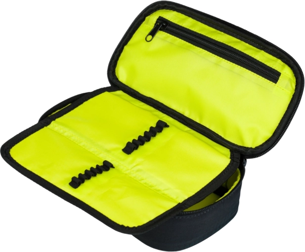 De binnenruimte is voorzien van elastische lussen en een ritsvak, wat zorgt voor een efficiënte organisatie van schrijfbenodigdheden.