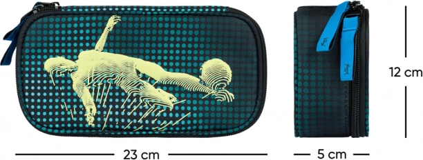 Het etui is versierd met een opvallend motief van een voetballer, wat de aandacht trekt van elke liefhebber van deze sport.
