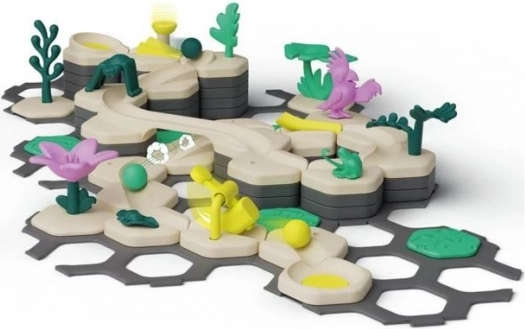 De set bevat alles voor direct speelplezier: maak routes door een bont junglethema, ontmoet grappige diertjes en combineer diverse actie-elementen. De hamer geeft de knikker extra kracht, de schommel verandert snelheid en richting en hoogte-elementen zorgen voor spannende afdalingen. Je kunt de baan uitbreiden met aanvullende themasets met motieven van de woestijn, de oceaan of het ijs – alles is volledig compatibel.