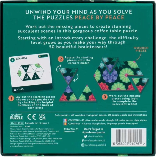 Ontspan je geest met de logische puzzel Peace by Peace: Succulenten, die prachtig design met slimme uitdagingen combineert. Stel afbeeldingen van succulenten samen uit houten driehoeken, werk je door 50 opdrachten en train je verbeeldingskracht en concentratie. Bevat 45 houten driehoekige stukjes, 50 instructiekaartjes en unieke voorbeeldpuzzels voor plezier voor kinderen en volwassenen.