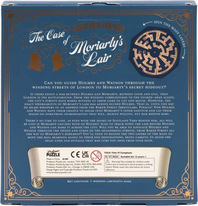 Dompel je onder in de wereld van SHERLOCK HOLMES en help Moriarty’s schuilplaats te onthullen in een slimme puzzel met een dubbel-laags doolhof. Draai aan beide schijven, leid de kogeltjes langs de juiste paden en vermijd doodlopende steegjes en valstrikken. Ideaal cadeau voor liefhebbers van detectives en logische uitdagingen, dat geduld en ruimtelijk inzicht ontwikkelt. Roterend doolhof, spannend detectivethema en plezier voor het hele gezin.