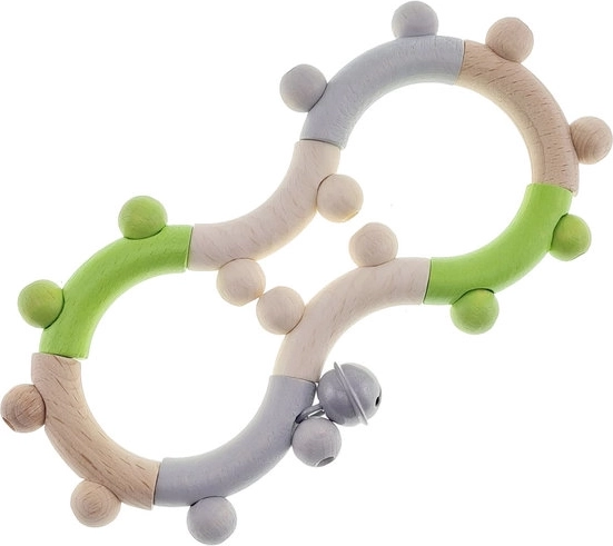 Ontdek het zachte houten rammelaartje in de vorm van een kleurrijke acht, dat al vanaf de geboorte de ontwikkeling van de fijne motoriek en de zintuiglijke waarneming ondersteunt. Dankzij het elastische koord kunnen de afzonderlijke onderdelen gemakkelijk worden verschoven en in verschillende vormen worden gezet, waardoor het rammelaartje een geweldige metgezel is, zowel thuis als onderweg.