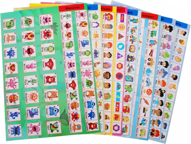 Geïllustreerde kaarten met categorieën (gezichten, vormen, vervoer, familie, monstertjes) ondersteunen de ontwikkeling van woordenschat, aandacht en het vermogen om associaties te maken.