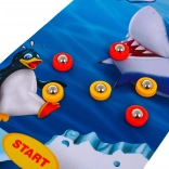 Grote, duidelijk gemarkeerde mat met start en genummerde vakken voor eenvoudig punten tellen. Het oceaanthema met pinguïns en een haai versterkt de spelbeleving.